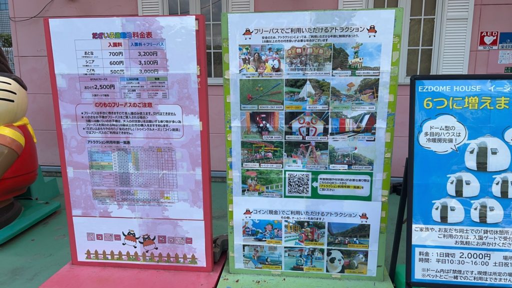 入り口付近に、料金・フリーパスなどの説明ボードがあります。今回は、入場料(大人700円×2人)+1つづり1,000円(100円×11枚)の回数券を購入しました。我が子は2歳でしたので無料でした。今回は特に年齢の証明書は必要なかったです。