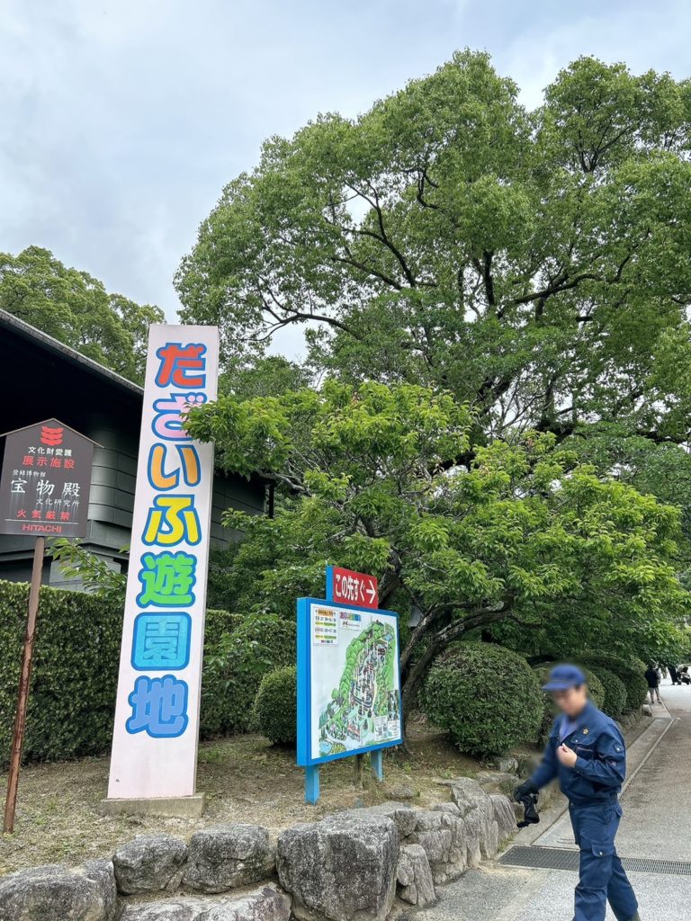 太宰府天満宮の境内にある【だざいふ遊園地】。宝物殿の横に道案内が書いてありました。