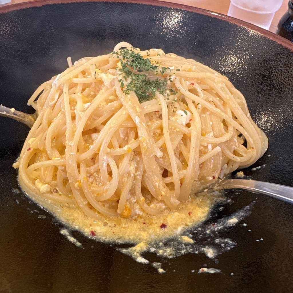 パスタの名店【らるきい】の一度は食べたい、にんにくと唐辛子のペペロンチーノをベースにふわふわのたまごが絡んだパスタ、“ぺぺたま”はクセになるお味!かなりにんにくキイテマシタ☆
