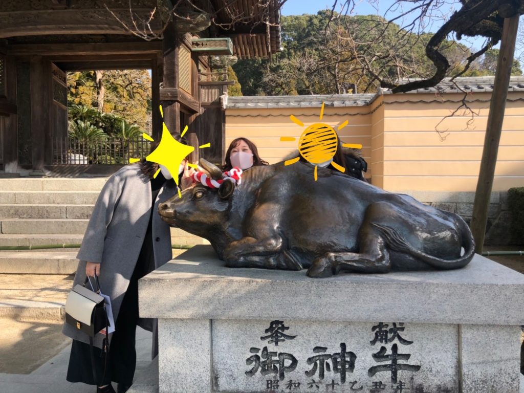 こちらの牛の像は、頭脳明晰だった菅原道真のご利益によって『頭をなでると知恵を授かる』といわれており、多くの方に親しまれています。