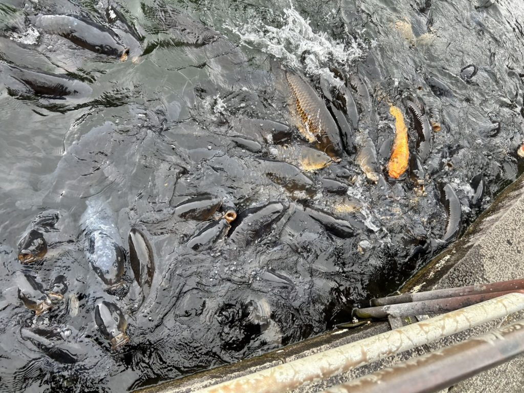 大暴れの鯉、鯉、コイ!大きすぎでしょ。エサやり場があり、ここですくすく育ったであろうBIGサイズの鯉。ちょっと怖い。