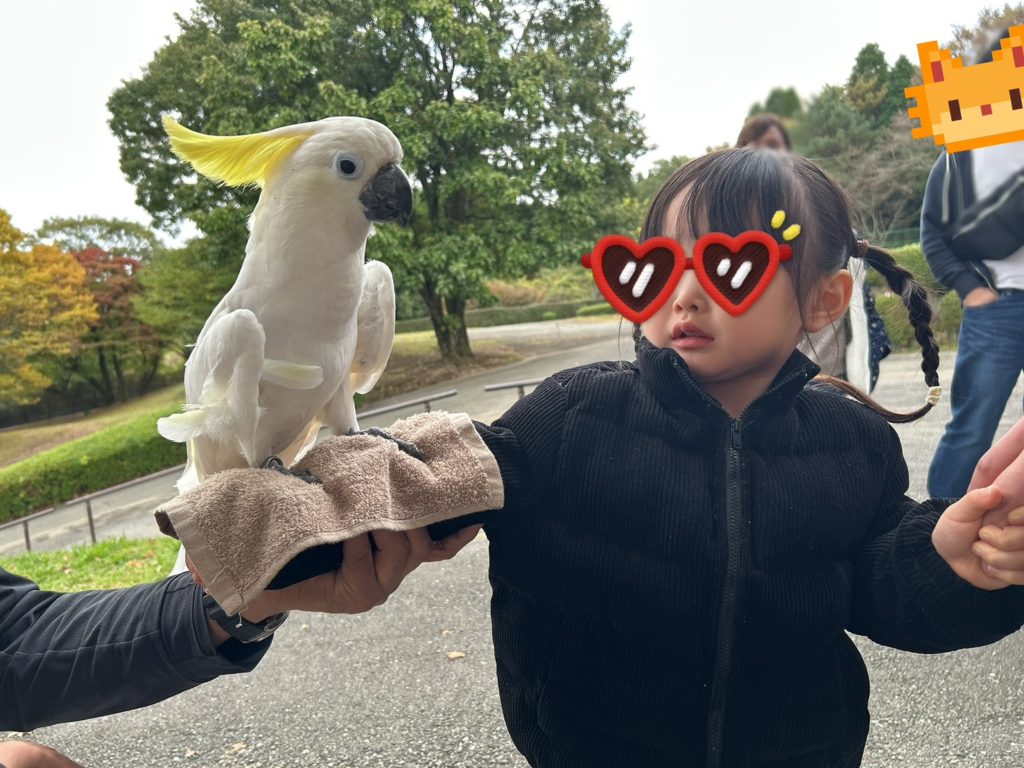 あっという間に我が子の腕にインコが乗せられていました!!笑