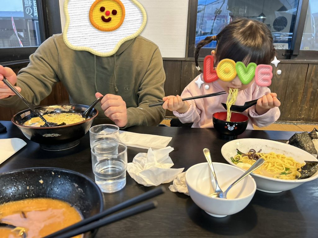 主人と娘は豚骨ラーメンをすすっていました。熊本ラーメン美味しいよね~。