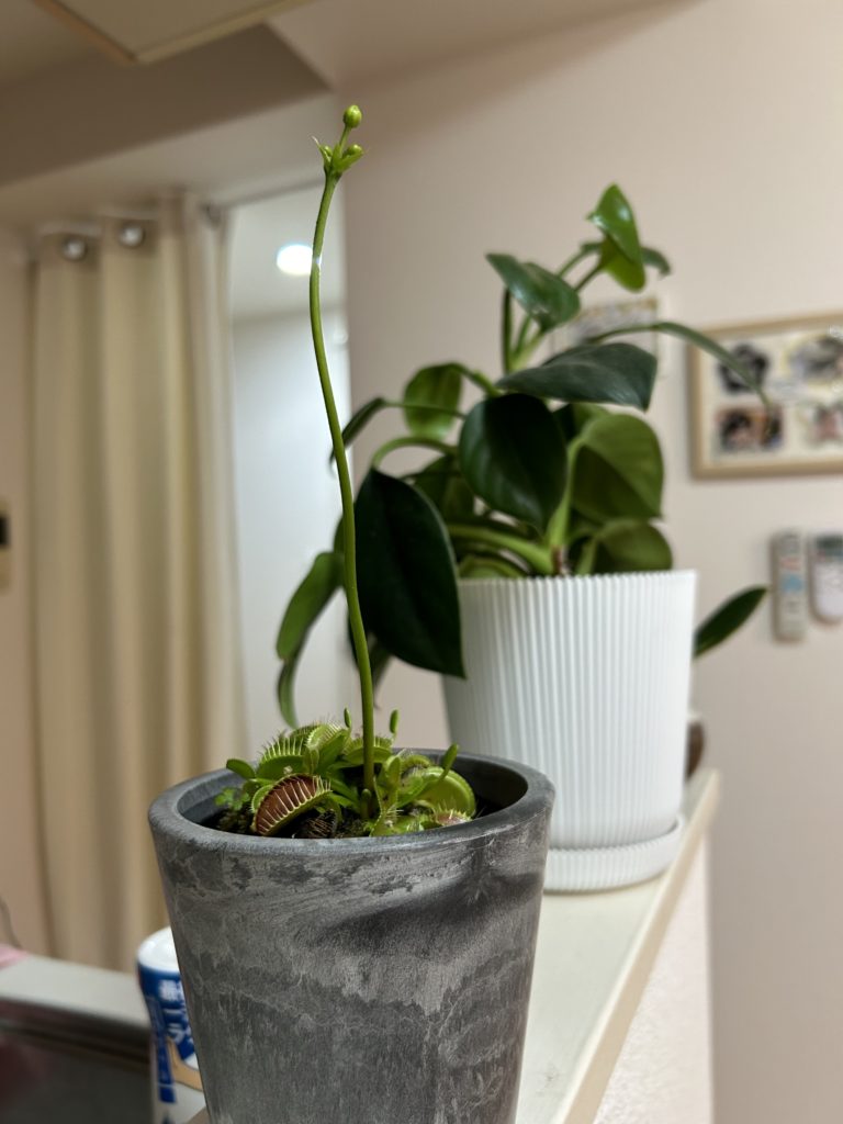 キッチンにいるメンバー。一番手前の食虫植物さんは残念ながら枯れてしまった…。奥のフィロデンドロン(3歳)とサンスベリア(2歳)は日々成長中。