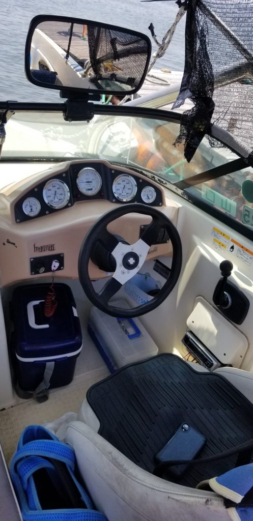 ボートはこんな感じ! 運転席もパシャリ。5~6人は乗れるのではないでしょうか。